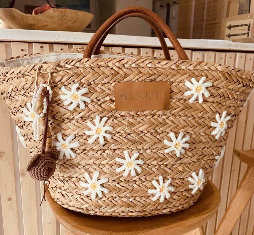 Panier osier "marguerites" , customisation d'été, fleurs au crochet